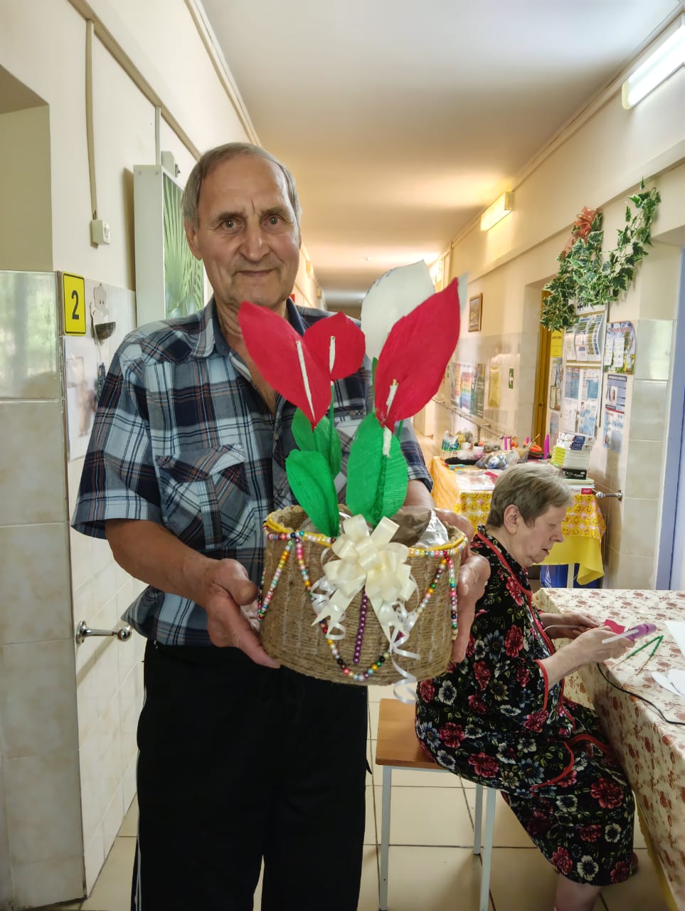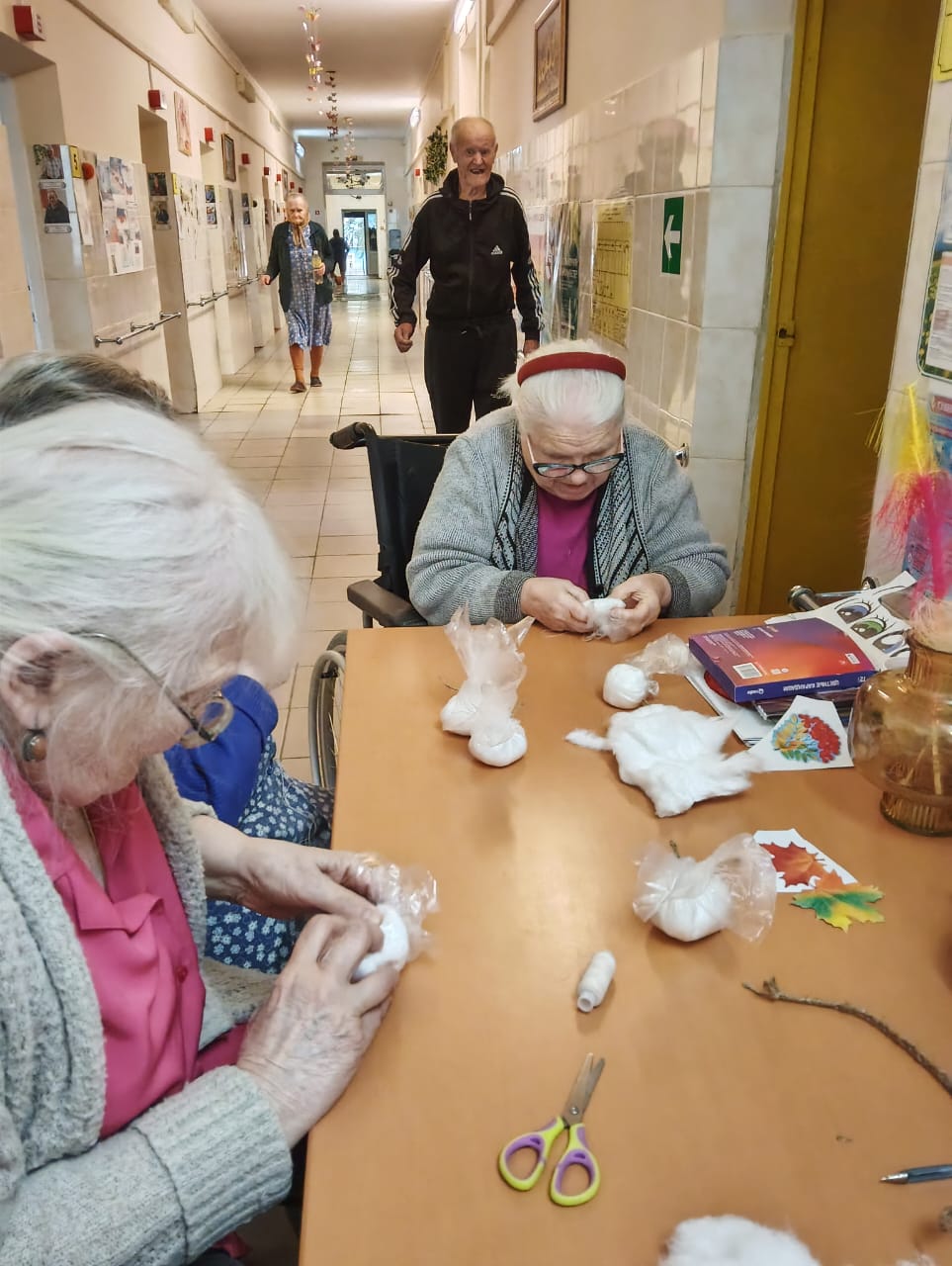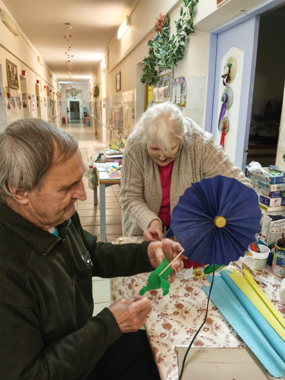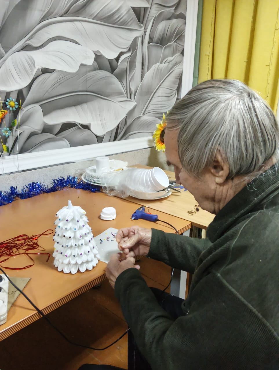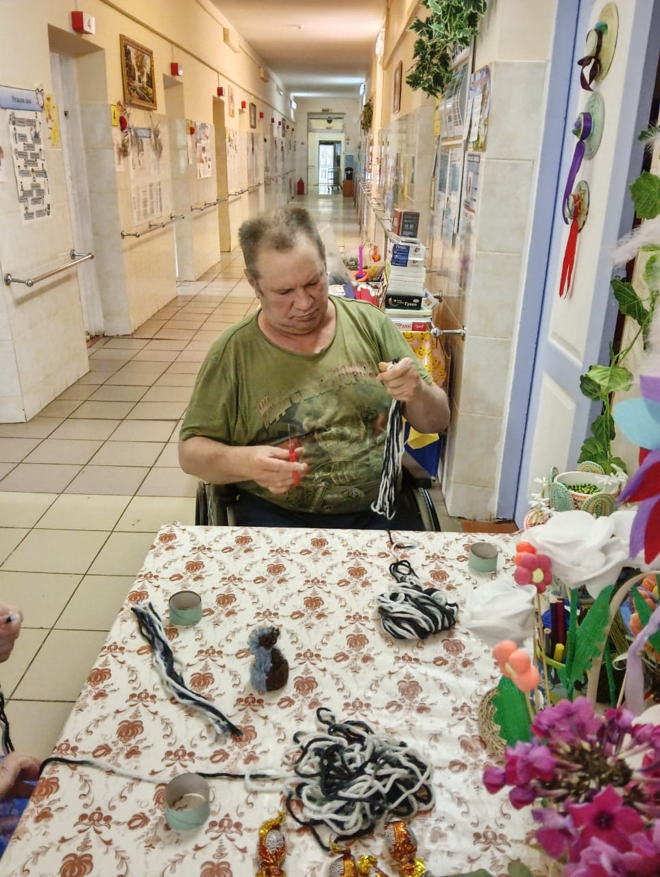 Проживающие в доме-интернате активно участвуют в подготовке к празднику. Они с радостью помогают украшать коридоры и комнаты, развешивают гирлянды и создают новогодние композиции.