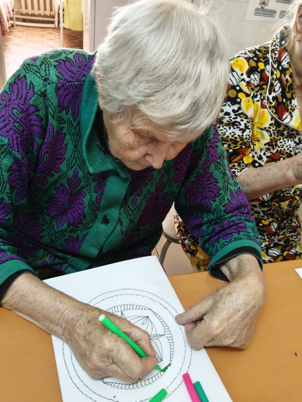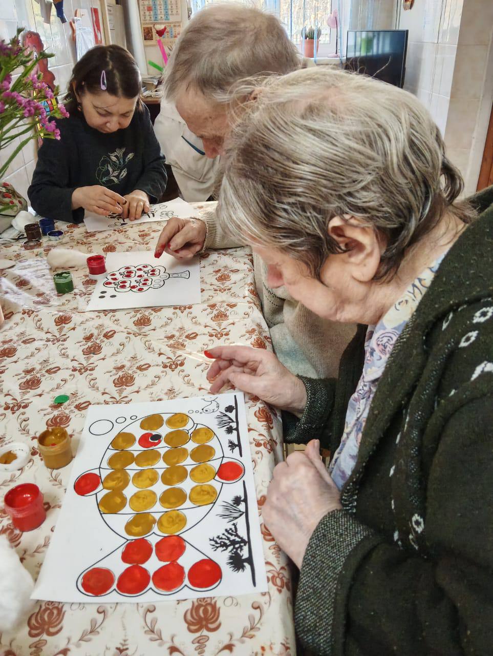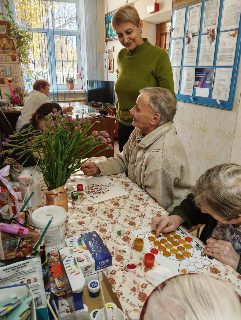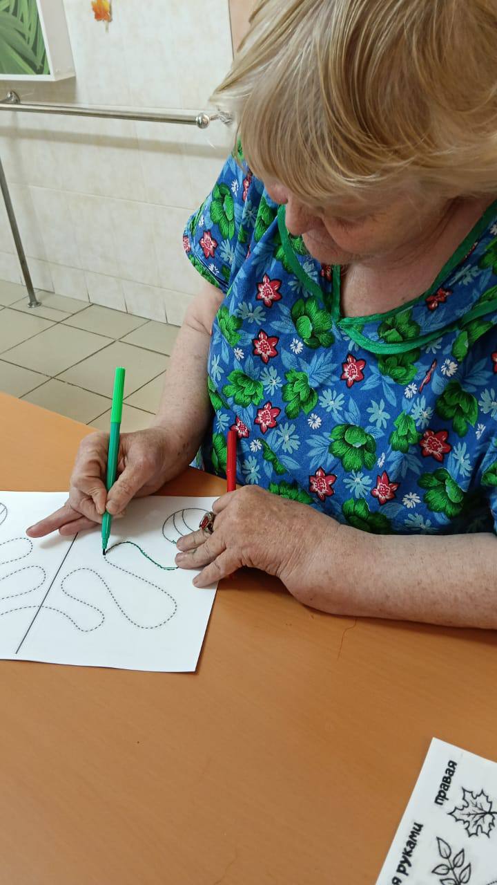 На занятии получатели социальных услуг очень старательно закрашивали пальчиками мелкие элементы и изгибы в узоре раскраски. Такое занятие способствовало сосредоточиться на аккуратности, полностью погружаясь в процесс, не только расслабиться, но и отвлечься от повседневных дел.