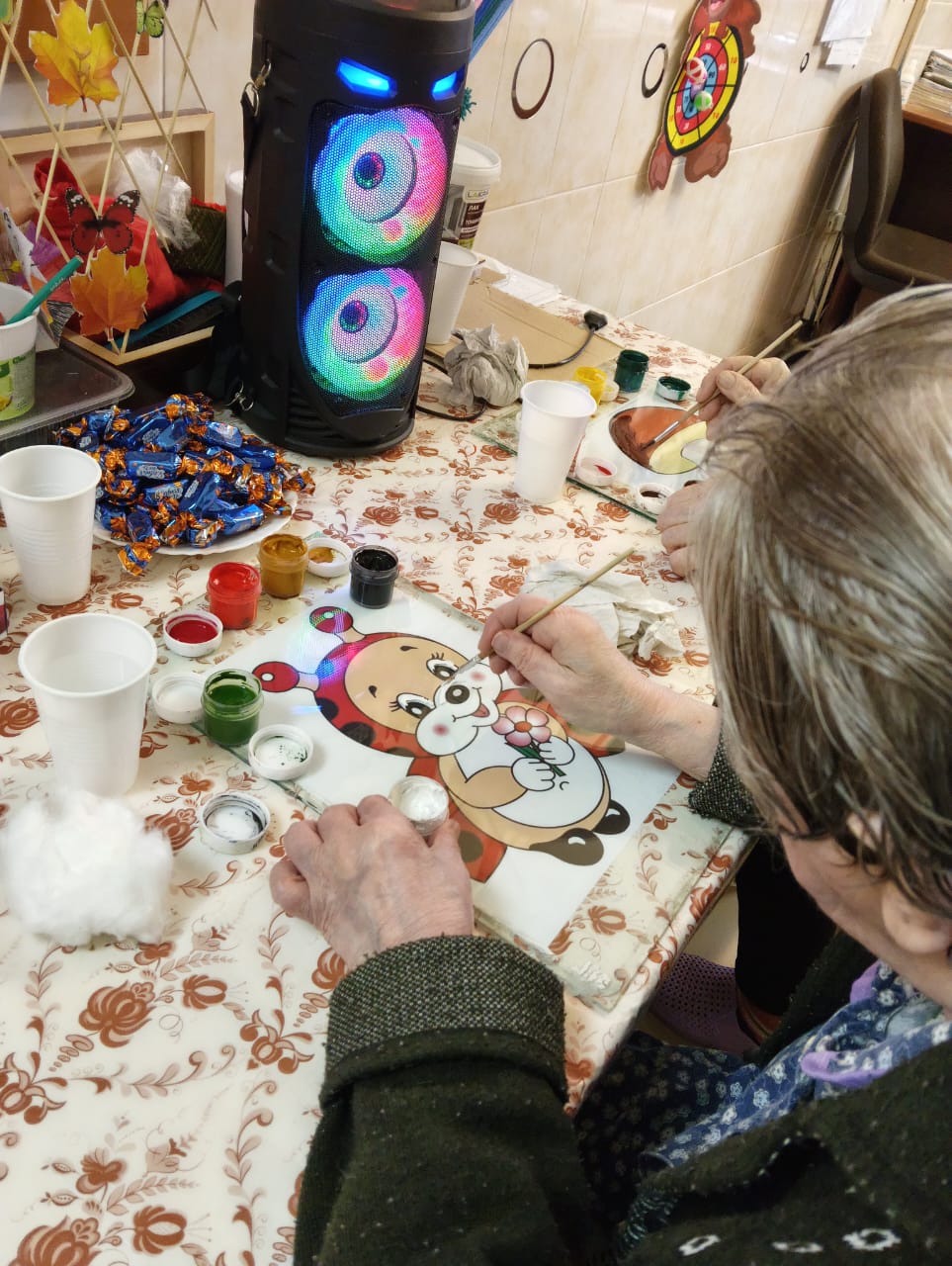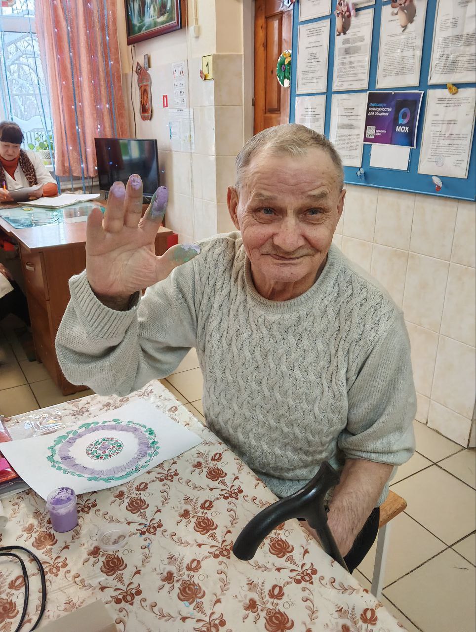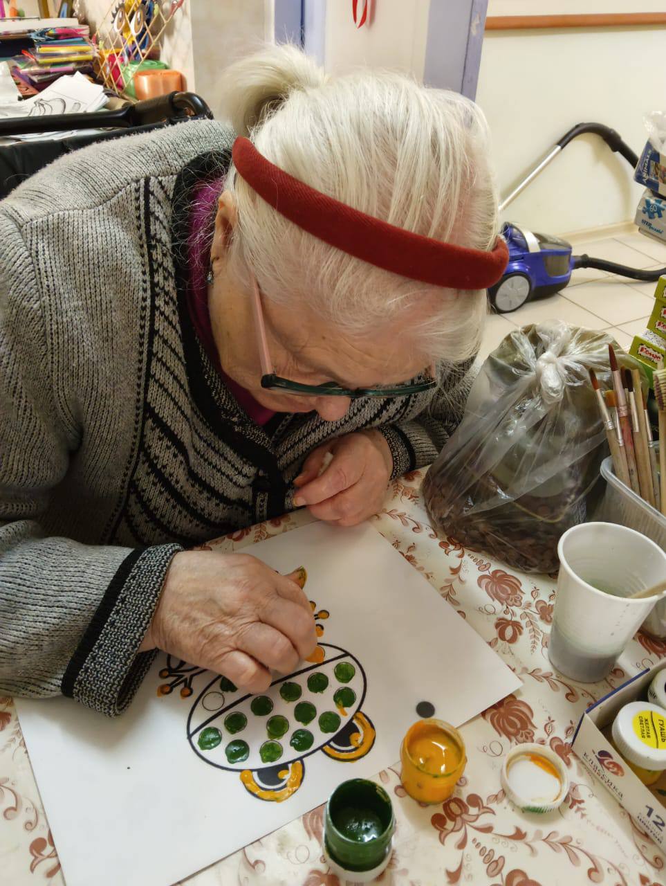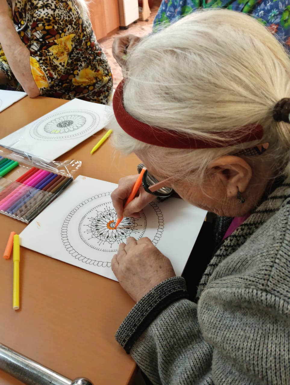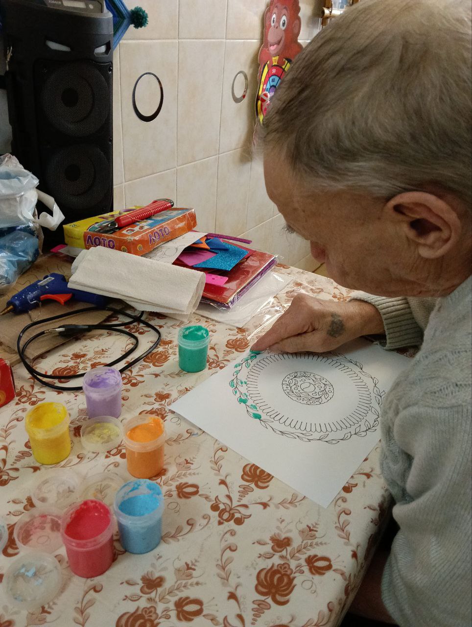На занятии получатели социальных услуг очень старательно закрашивали пальчиками мелкие элементы и изгибы в узоре раскраски. Такое занятие способствовало сосредоточиться на аккуратности, полностью погружаясь в процесс, не только расслабиться, но и отвлечься от повседневных дел.