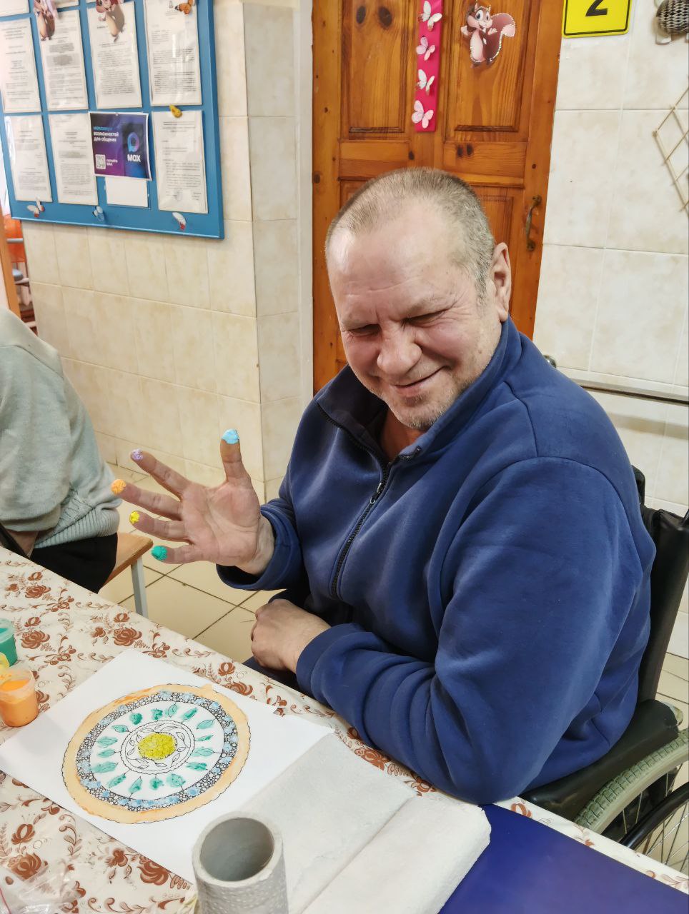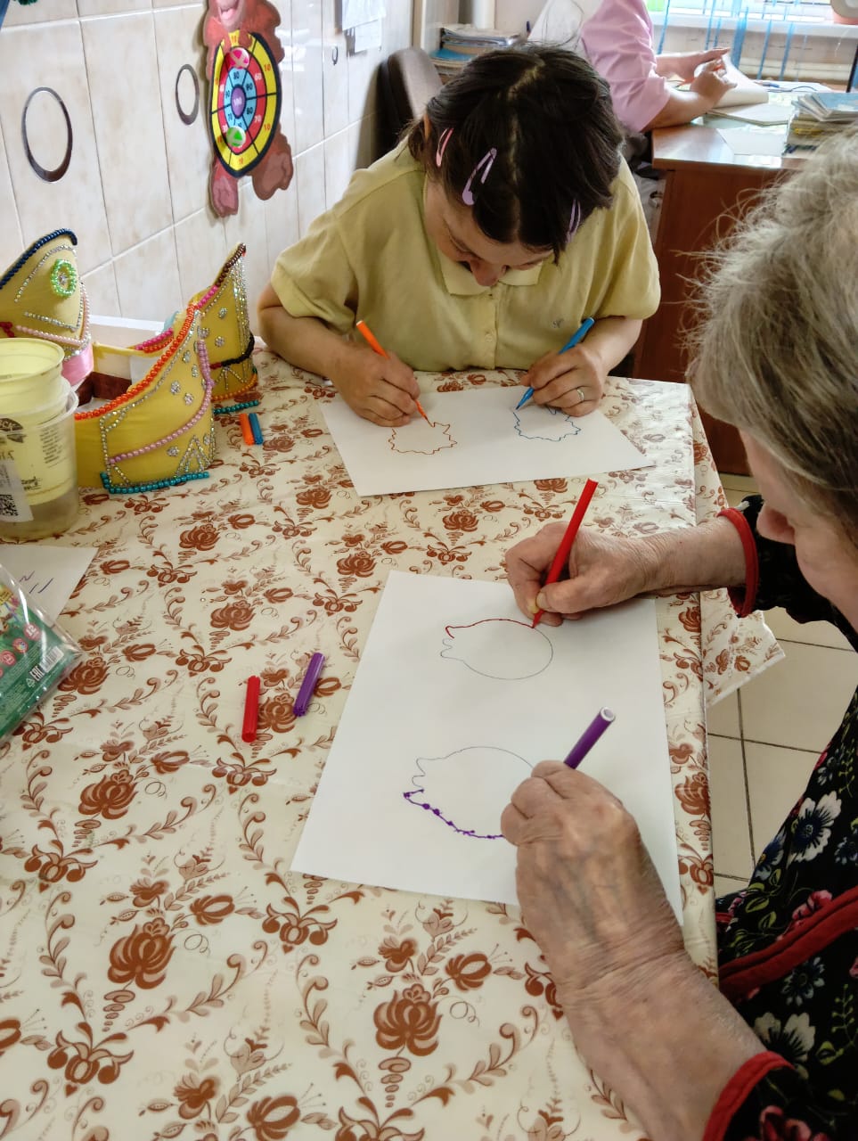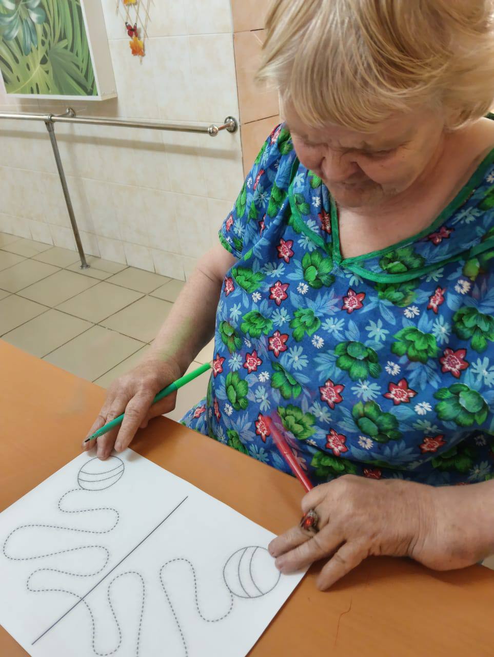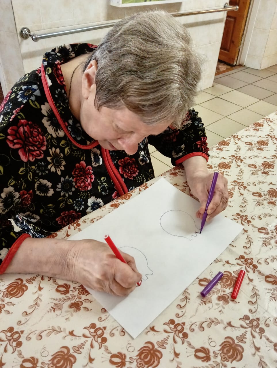 На занятии получатели социальных услуг очень старательно закрашивали пальчиками мелкие элементы и изгибы в узоре раскраски. Такое занятие способствовало сосредоточиться на аккуратности, полностью погружаясь в процесс, не только расслабиться, но и отвлечься от повседневных дел.
