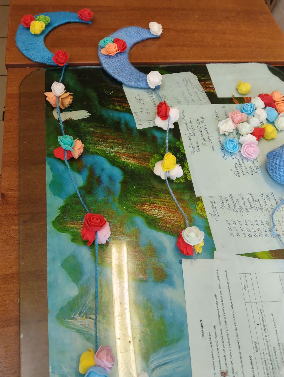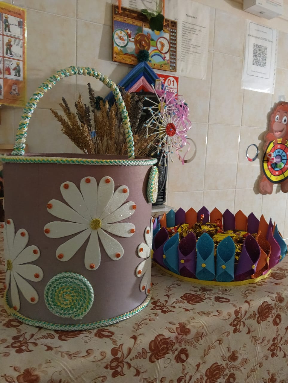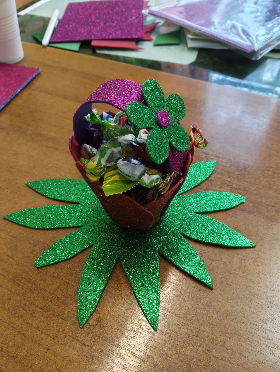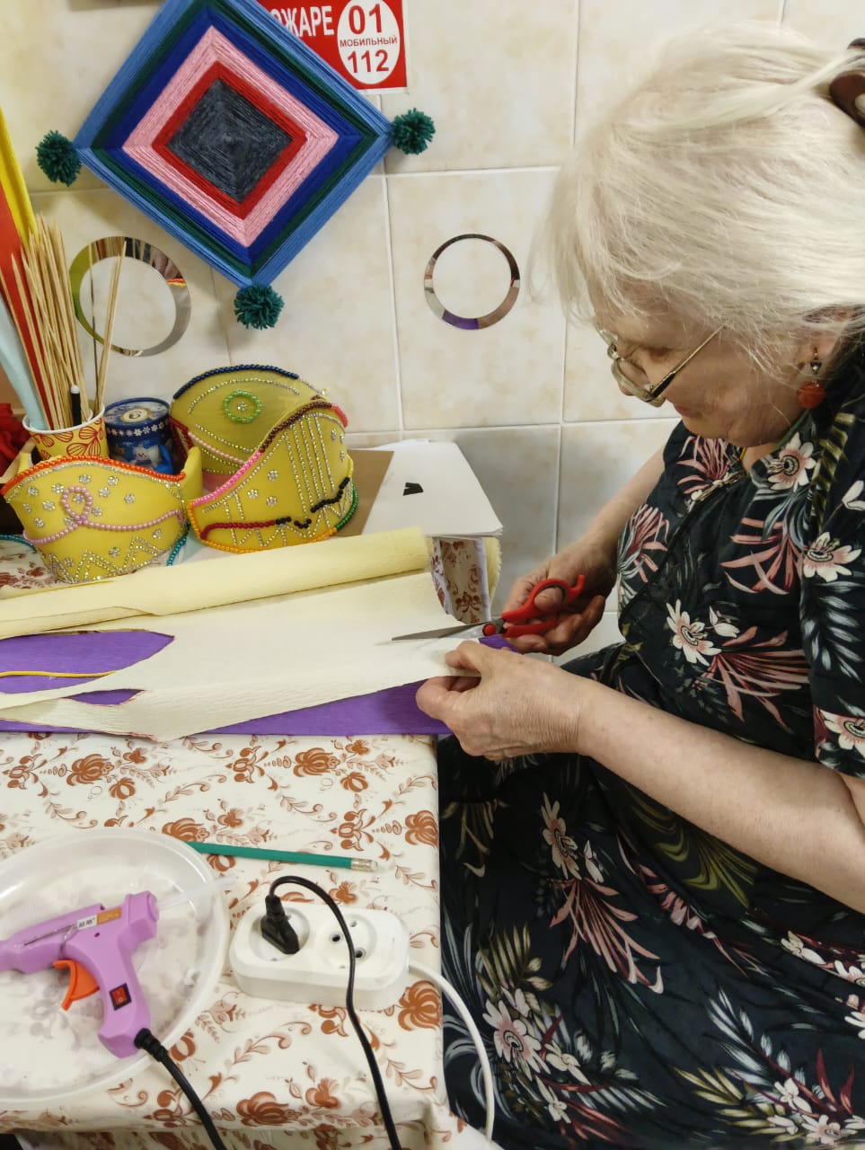 Из фоамирана при помощи выкроек проживающие вырезали заготовки, которые затем соединили между собой при помощи клеевого пистолета. Сами корзиночки участники мастер-класса украсили декоративными цветами, также вырезанные из фоамирана.