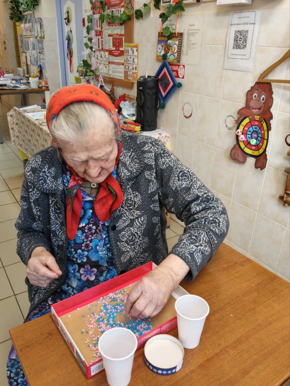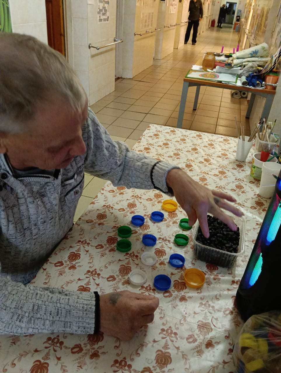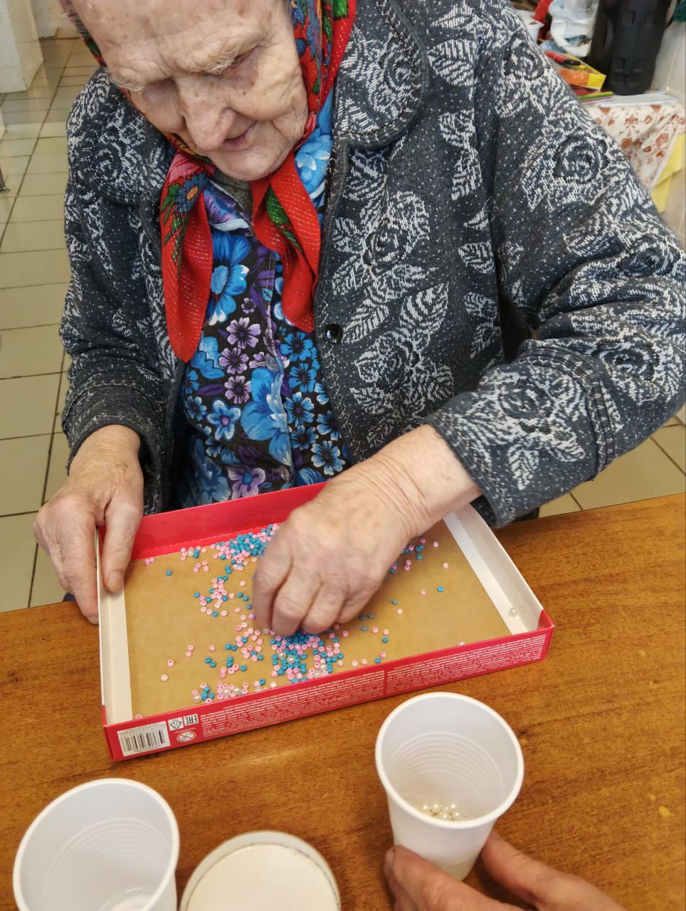 Сегодня прошло индивидуальное занятие с проживающей дома-интерната на развитие мелкой моторики при помощи бисера, который необходимо было разделить по цветам. Благодаря занятию у Клавдии Германовны улучшилось настроение, также появилась улыбка на лице от проделанной работы.