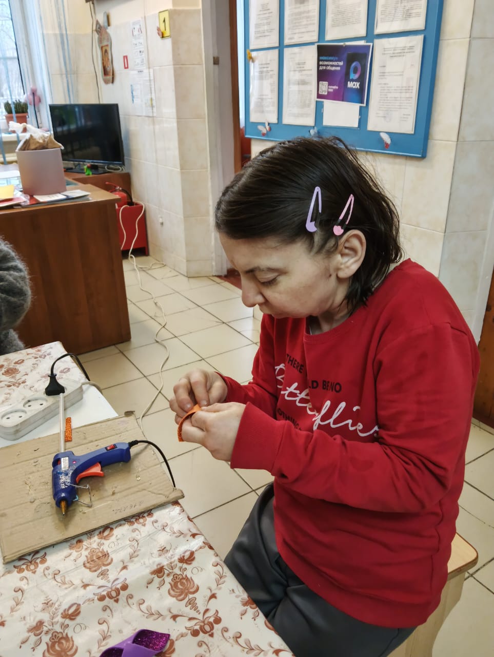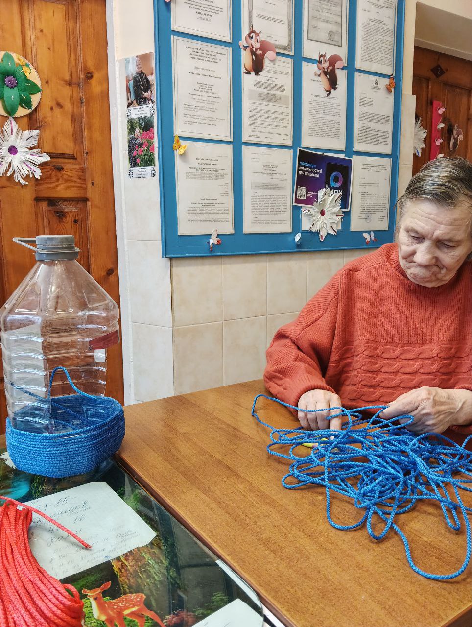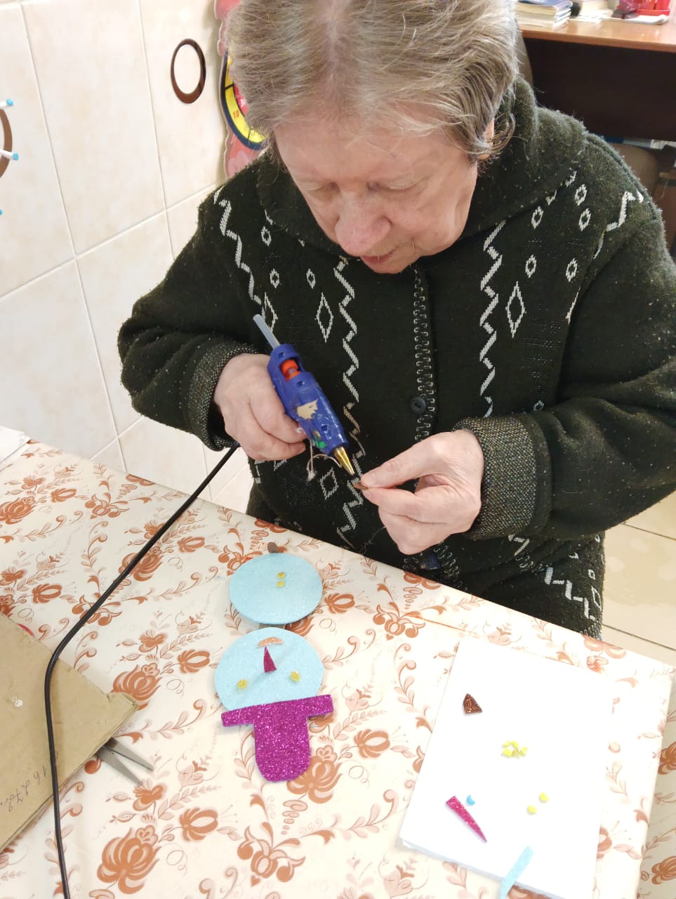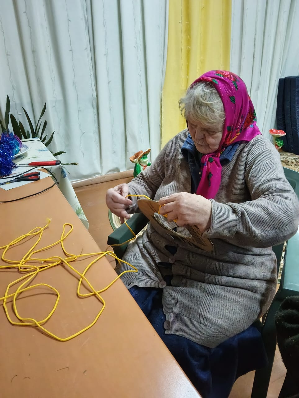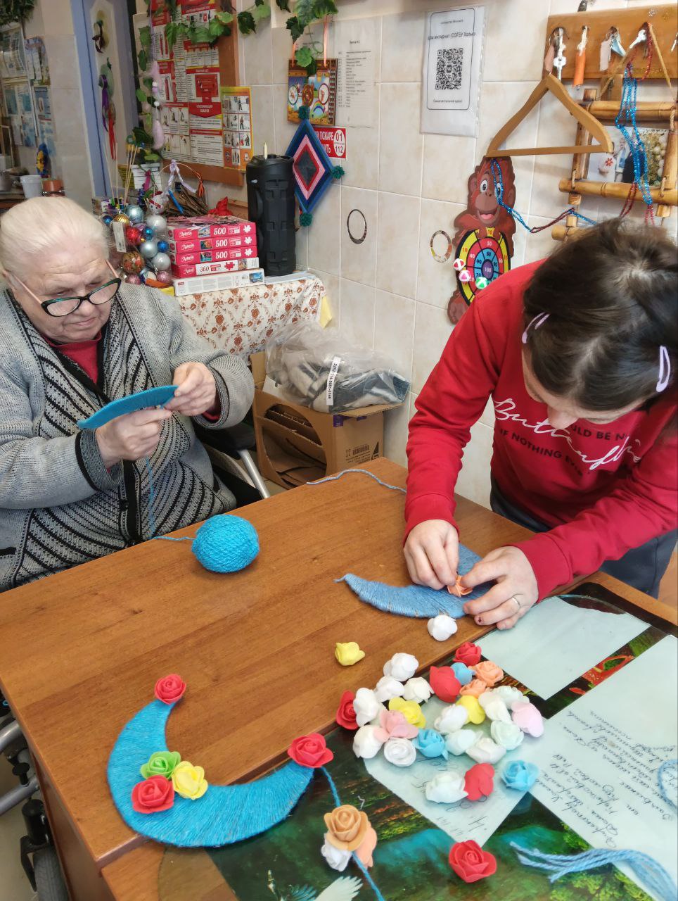 В ходе мастер-класса каждый смог проявить свою креативность, используя различные подручные материалы. Елочные игрушки мастерили из фоамирана, этот материал очень уж полюбился нашим проживающим, а вот рождественский венок — это целое произведение искусства. Для начала была вырезана заготовка, на которую наши мастера постепенно наматывали жгуты, а при украшении венка каждый проявил свою фантазию. В ходе мастер-класса проживающие не только занимались рукоделием, но и вспоминали о теплых моментах, связанных с празднованием Нового года. Они делились историями из своей жизни, смеялись и радовались процессу творчества.