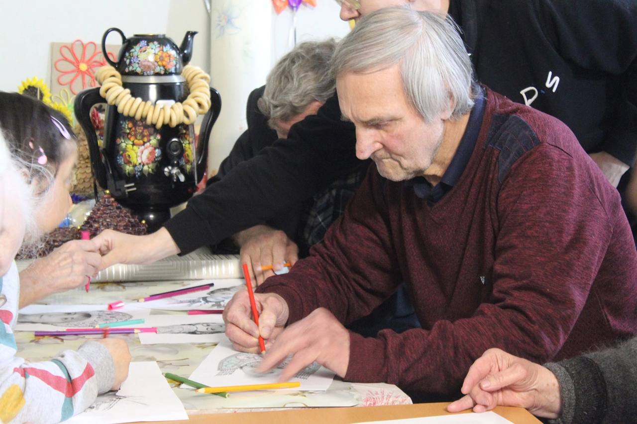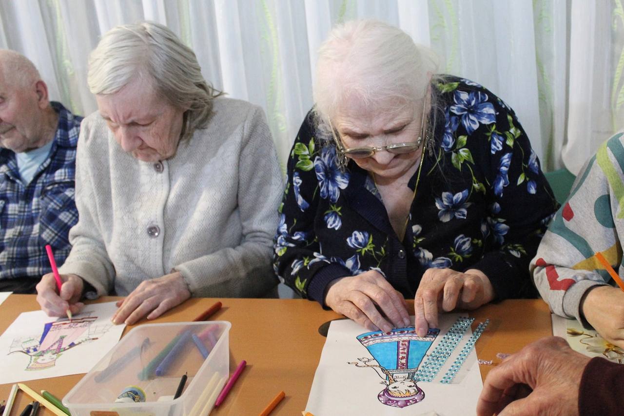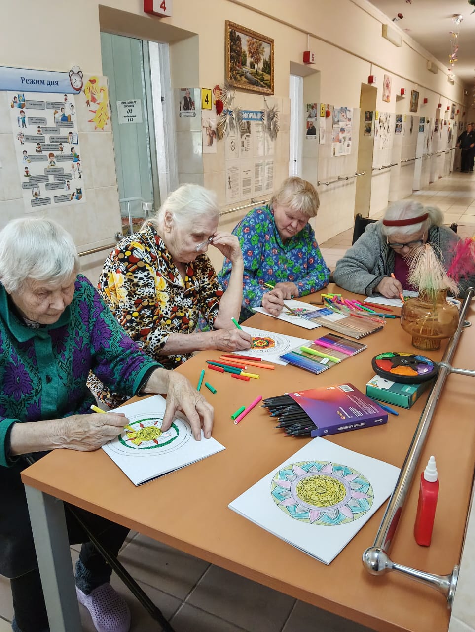 19 января 2026 года в Холмовском доме-интернате для престарелых и инвалидов прошло релаксационное занятие под названием «Антистресс-раскраски». Это один из видов арт-терапии, а раскрашивание – приятное и полезное занятие. Идея раскрасок, как способа расслабиться, возникла давно – еще Карл-Густав Юнг советовал своим пациентам раскрашивать картинки с мандалами для снятия стресса.