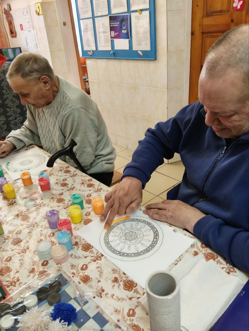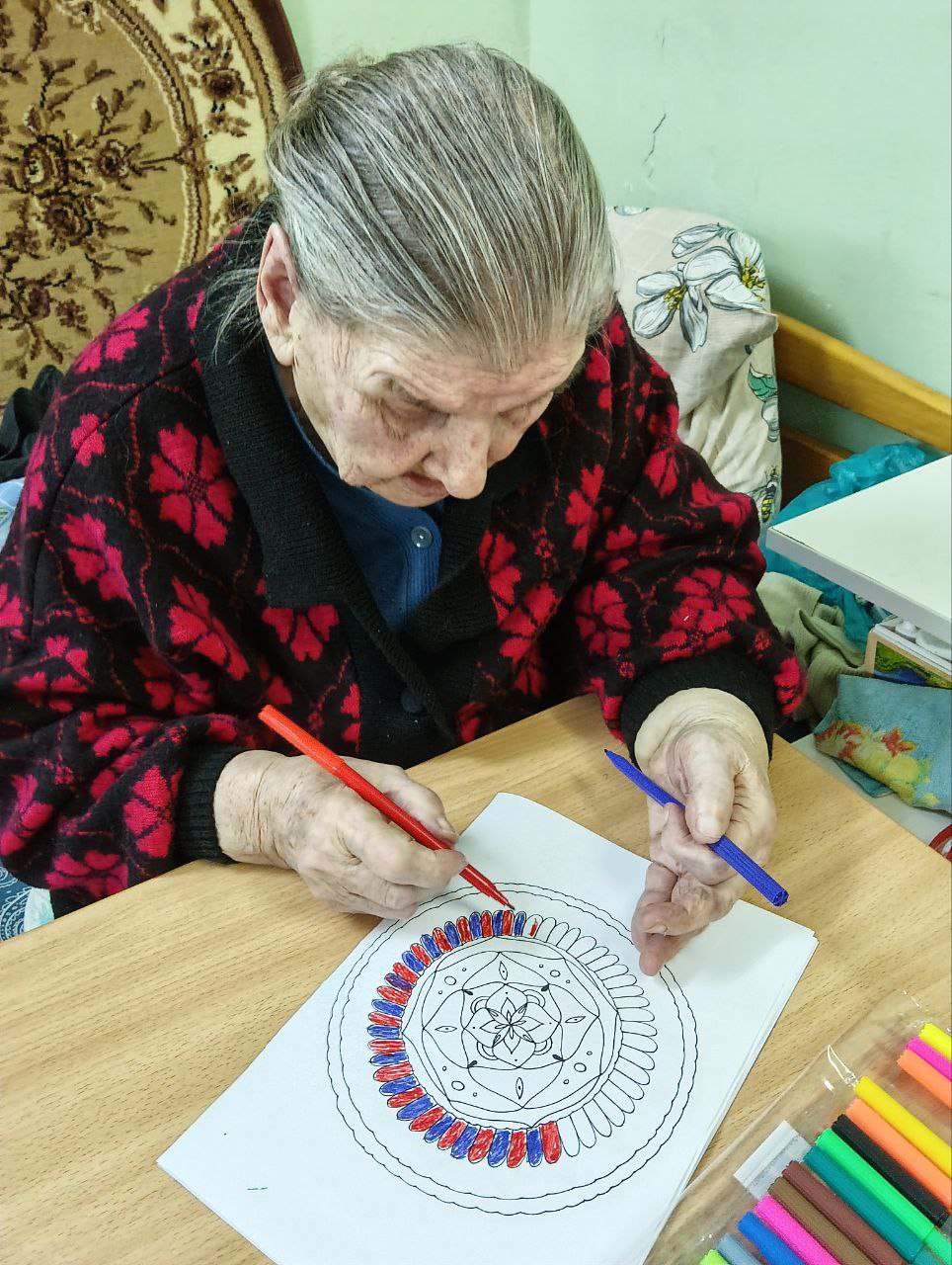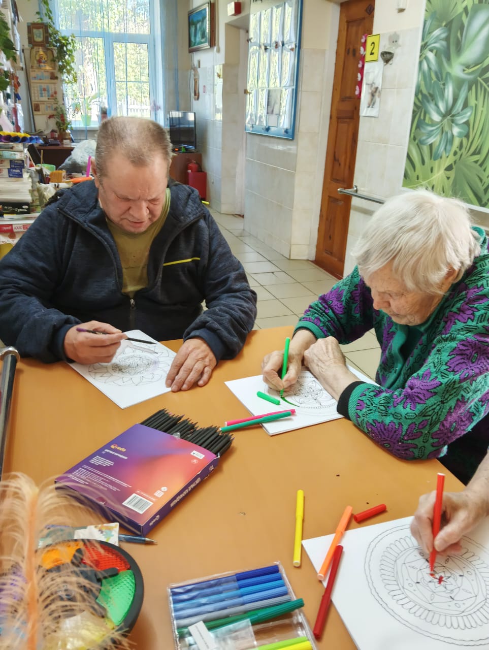 19 января 2026 года в Холмовском доме-интернате для престарелых и инвалидов прошло релаксационное занятие под названием «Антистресс-раскраски». Это один из видов арт-терапии, а раскрашивание – приятное и полезное занятие. Идея раскрасок, как способа расслабиться, возникла давно – еще Карл-Густав Юнг советовал своим пациентам раскрашивать картинки с мандалами для снятия стресса.
