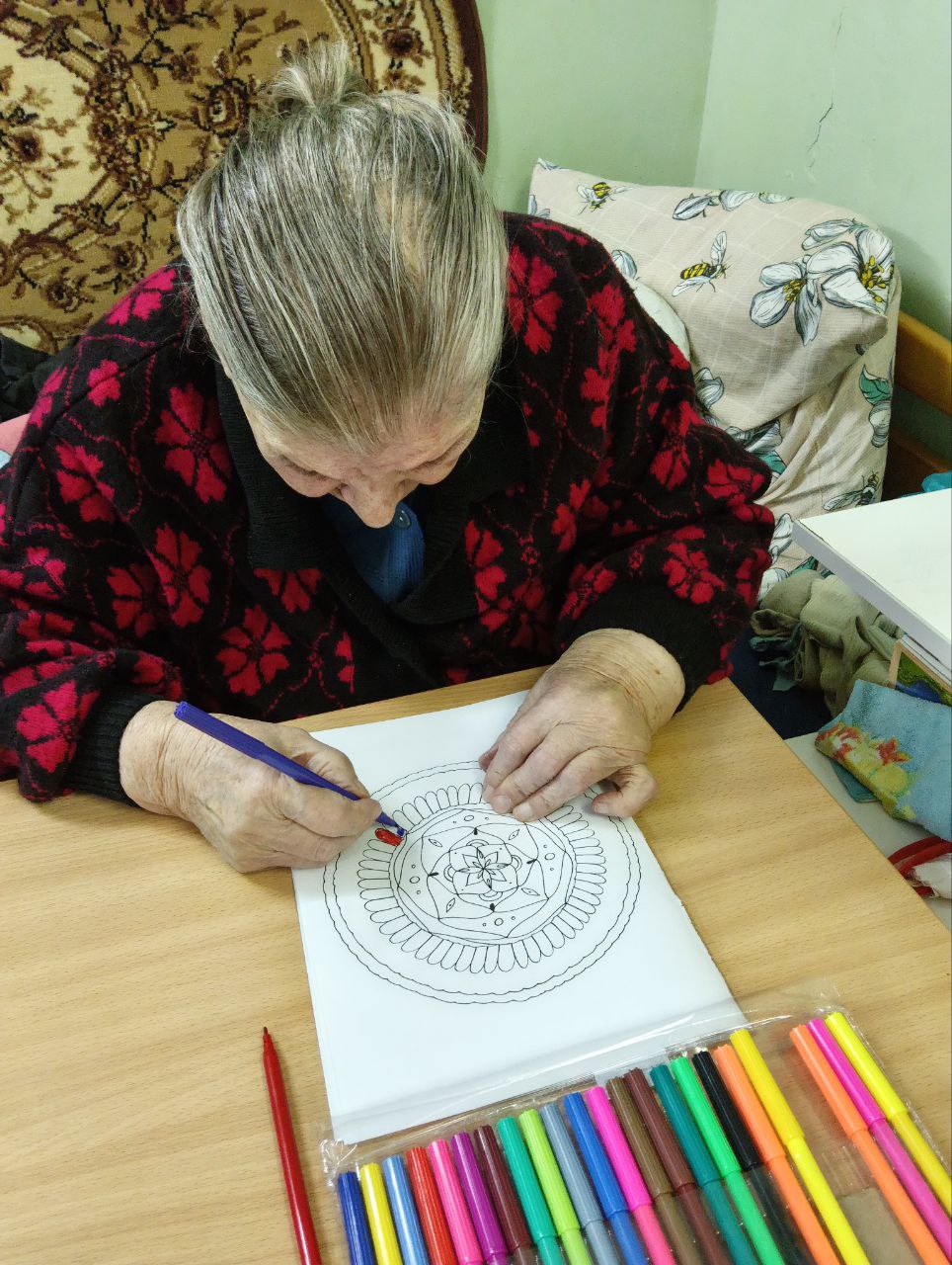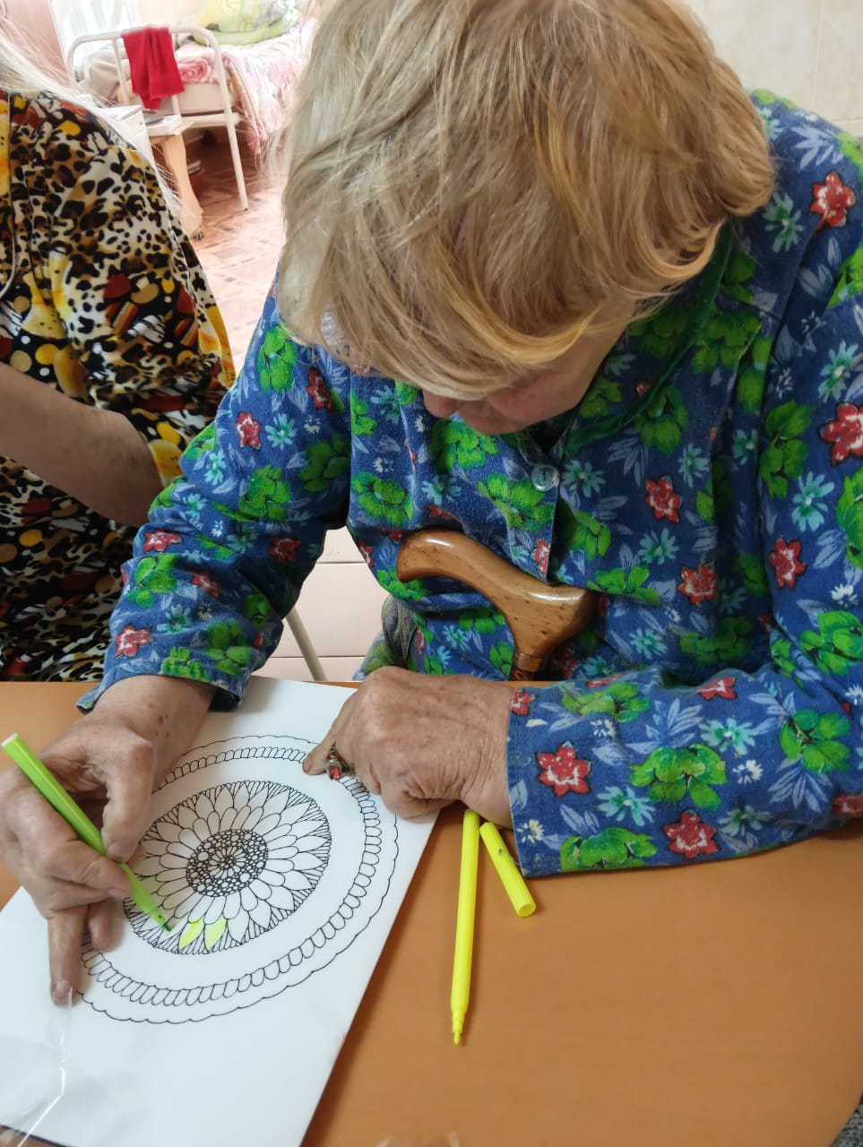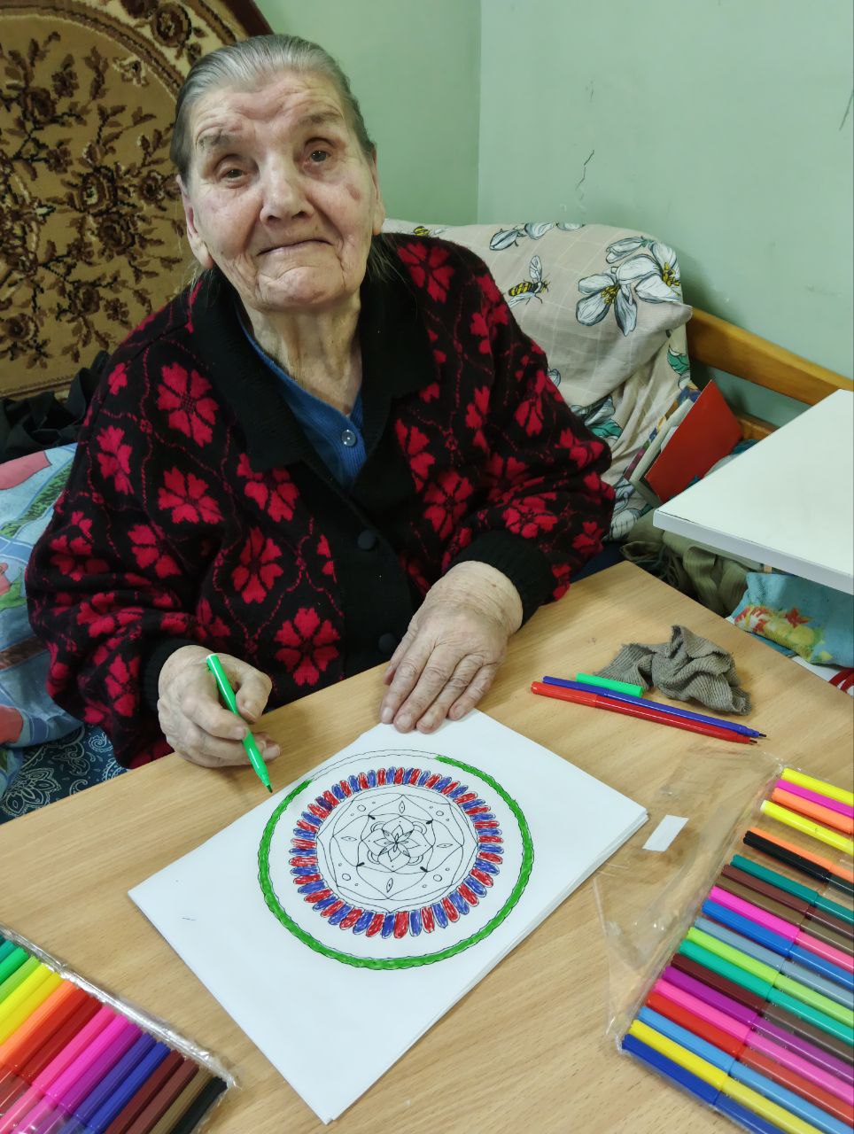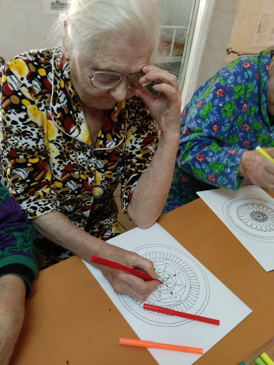 Сегодня занятие по арт-терапии «Антистресс-раскраски» было проведено с маломобильными проживающими. Было организованно рабочее место и Татьяна Ивановна с большим удовольствием приступила с раскрашивания фломастерами этих замысловатых рисунков.