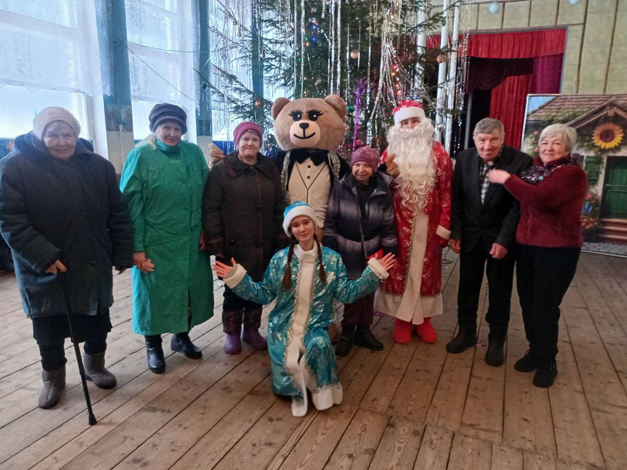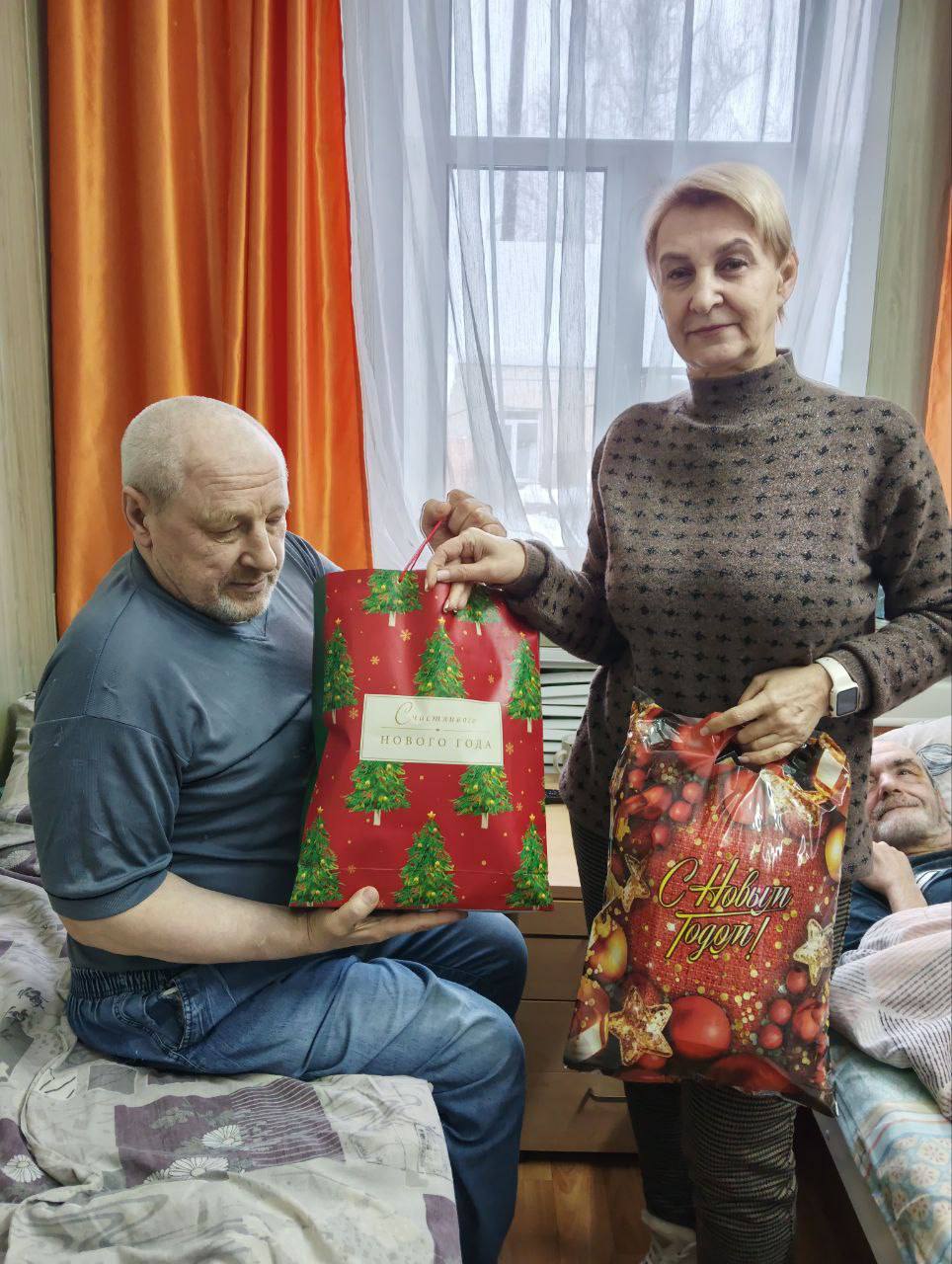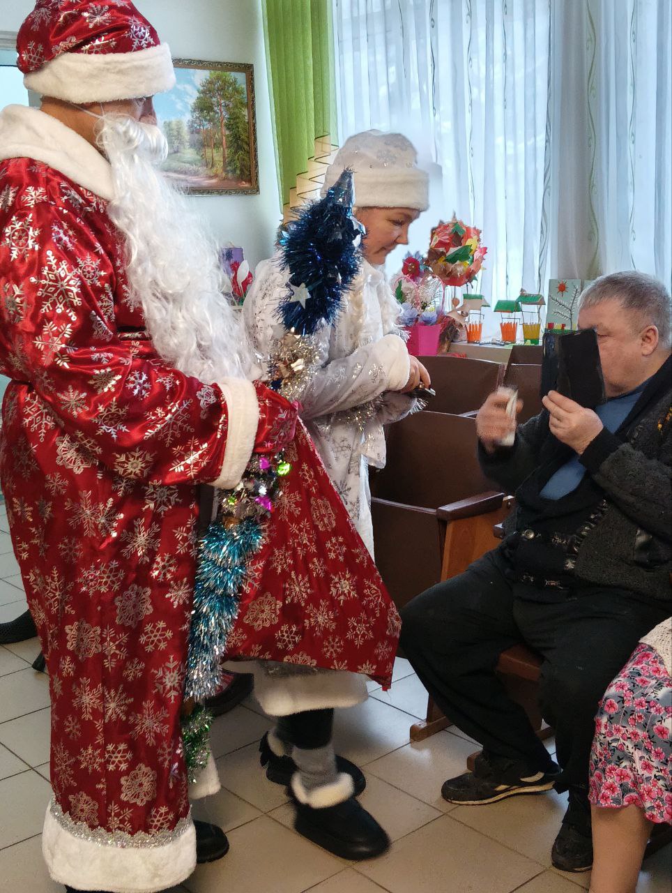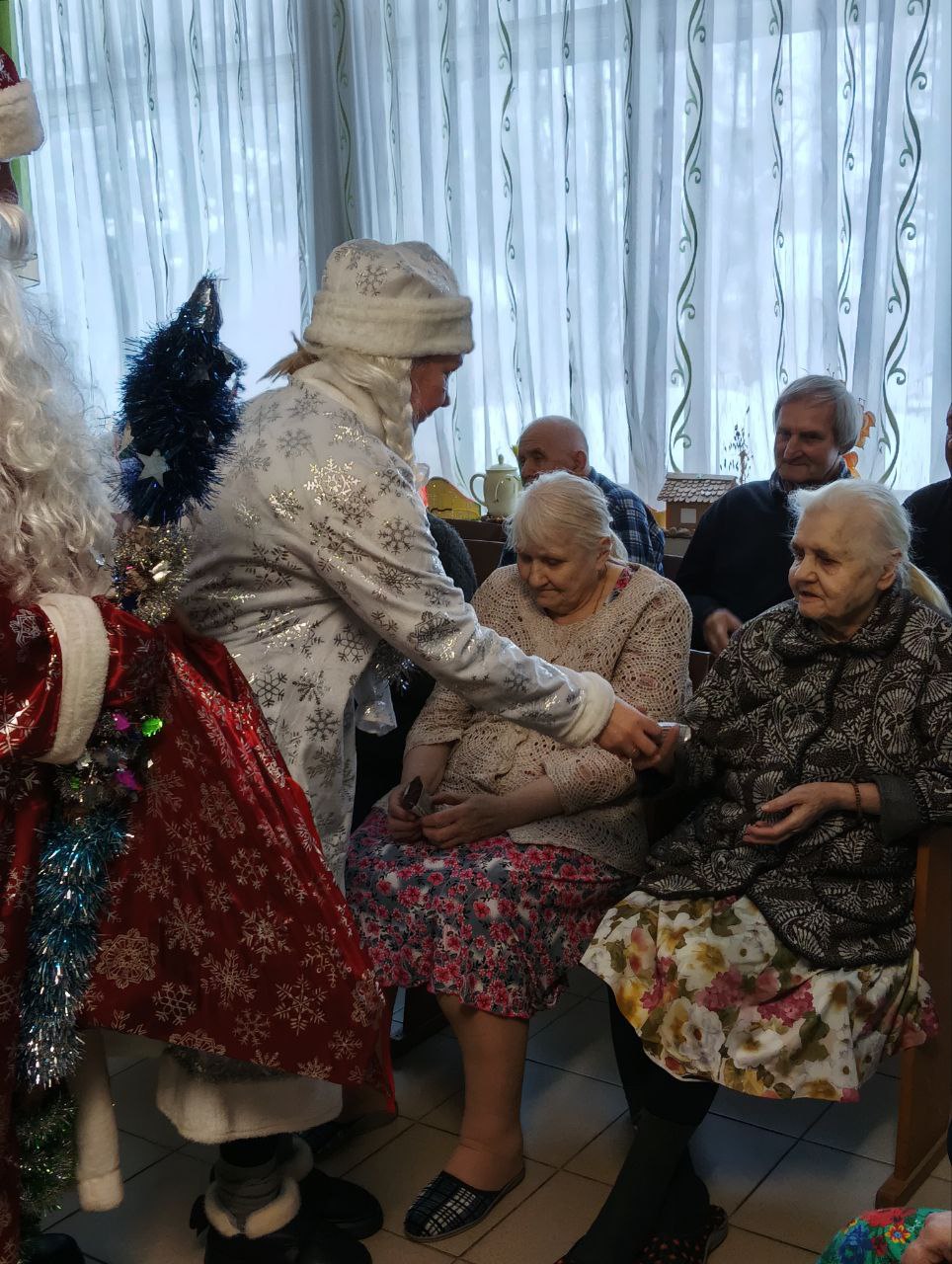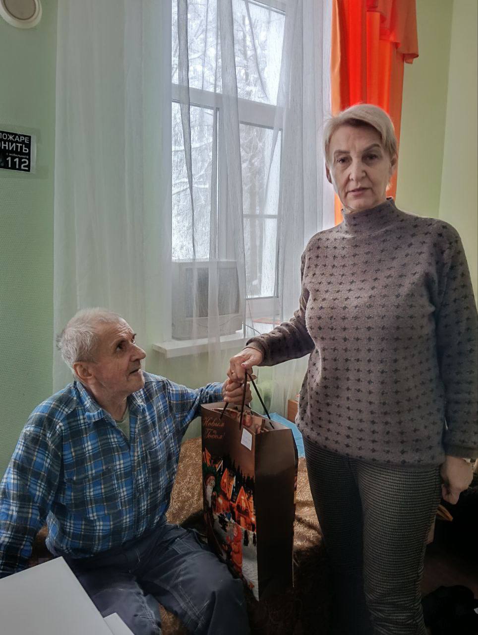 Дед Мороз с помощниками вручил сладкие подарки, которые были собраны учениками, их родителями и педагогами школы, всем постояльцам.
