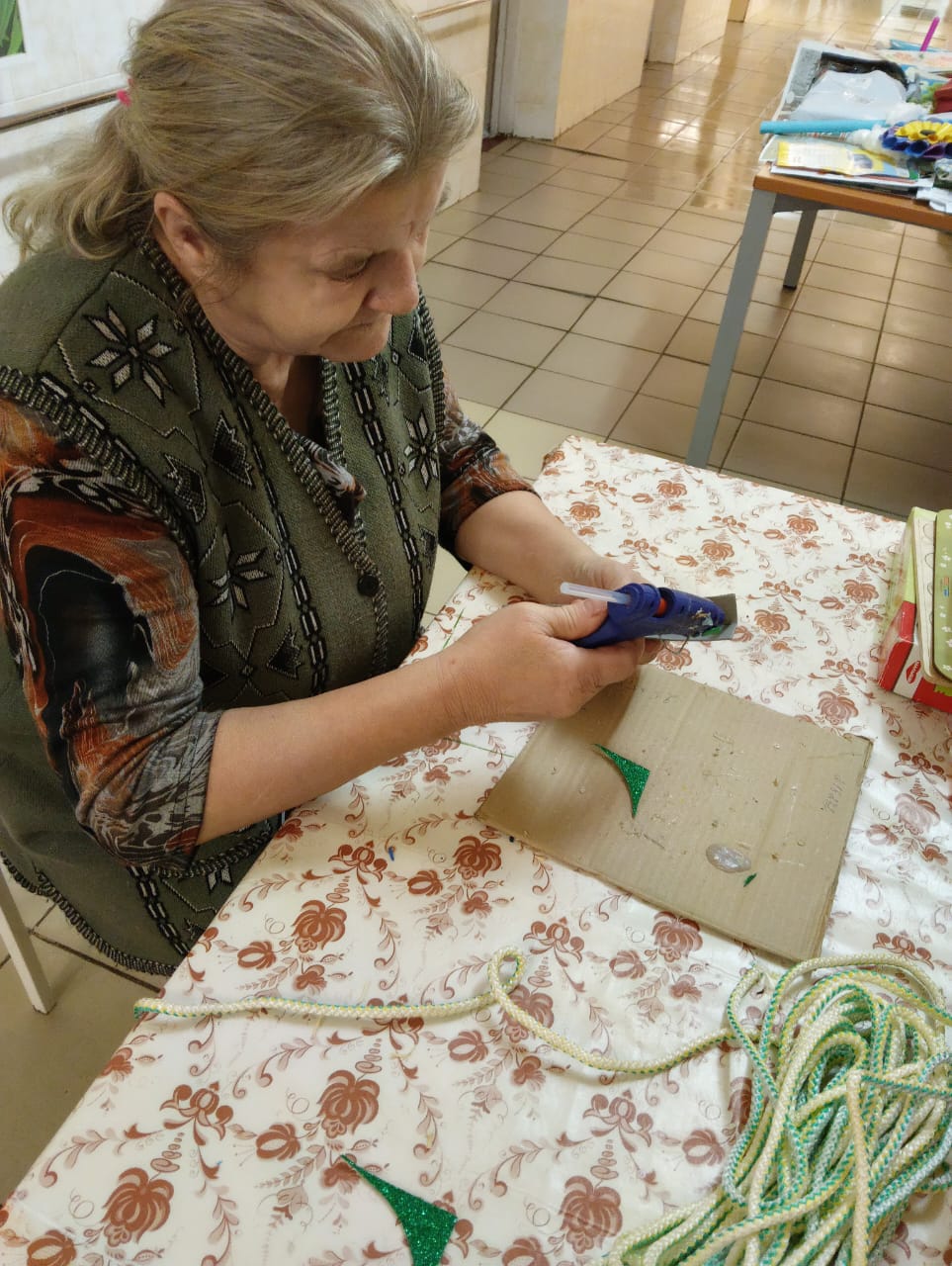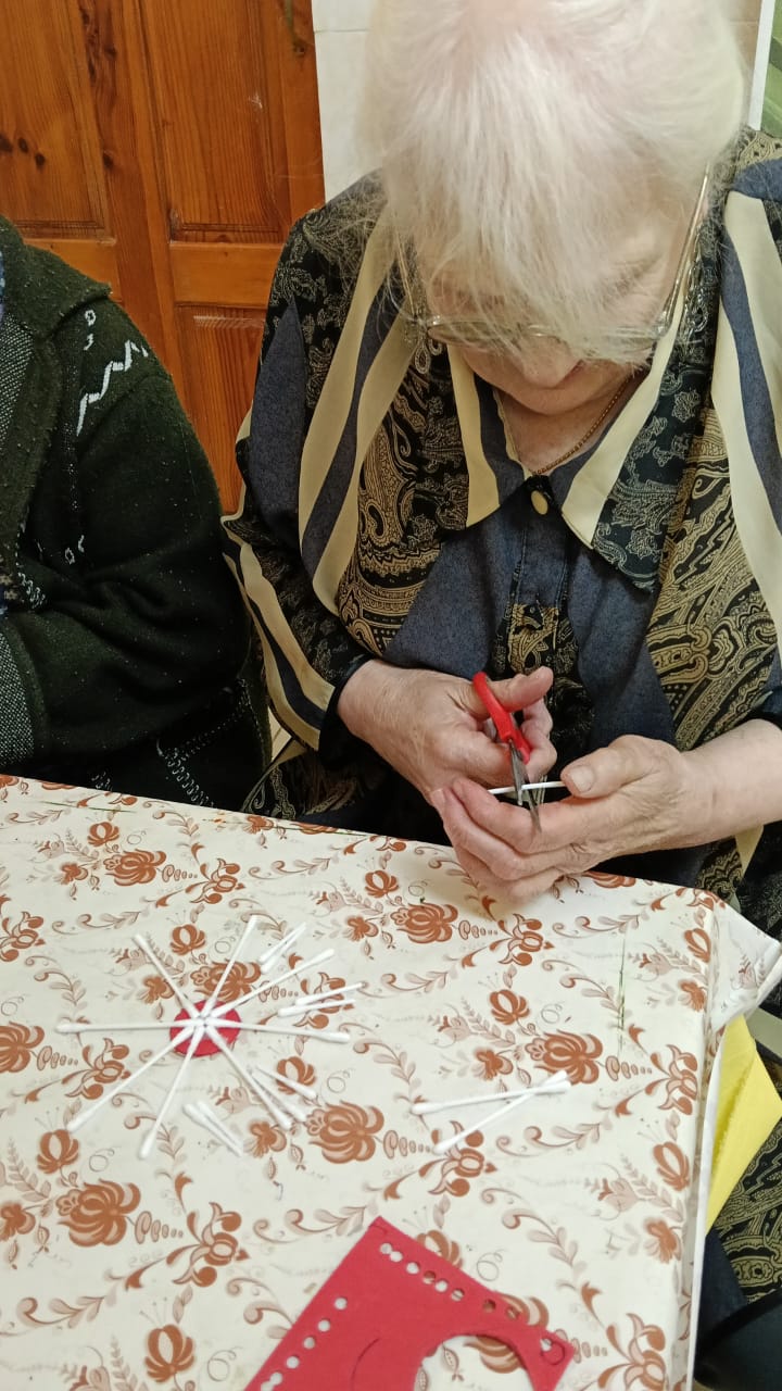 Сегодня получатели социальных услуг Холмовского дома-интерната попробовали сделать новогоднюю ёлку самостоятельно. Для создания елочки решили использовать ватные диски, так как материал был доступным и безопасным для пожилых людей. С радостью взялись за работу, каждый хотел внести свой вклад в создание праздничной атмосферы.